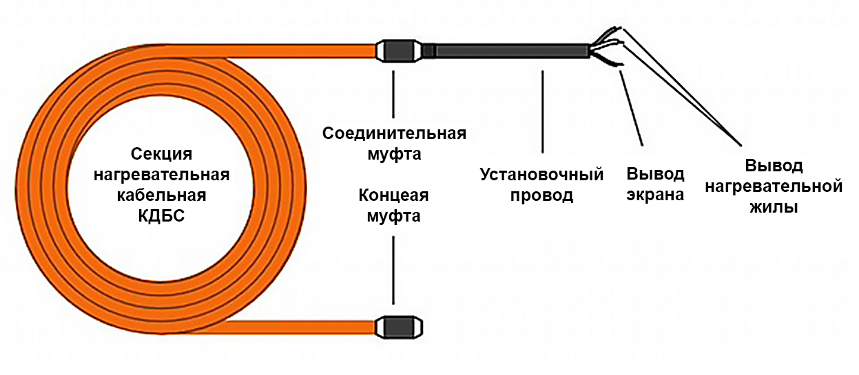 Кабель 40КДБС представляет из себя отдельные секции экранированного двухжильного кабеля длиной от 10 до 150 м. С одной стороны секции имеется соединительная муфта с установочным проводом длиной 2 м и наконечниками для подсоединения к питанию 220 В, с другой — концевая муфта.