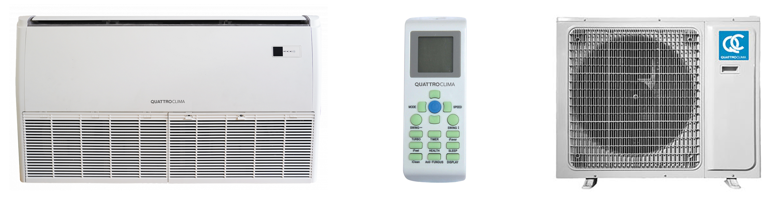 Сплит-система постоянной производительности, применяется для кондиционирования торговых и офисных помещений большой площади или сложной формы. Главное достоинство — универсальность монтажа, его можно устанавливать как на полу вдоль стены, так и под потолком. Работает в 4 режимах: охлаждение, обогрев, вентиляция и осушение.