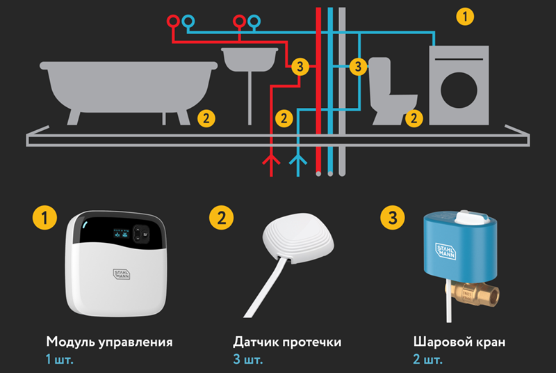 Краны STAHLMANN™ 1/2" 12В – 2 шт. Датчик STAHLMANN™ 001 – 3 шт. Модуль управления STAHLMANN™ Smart – 1 шт.