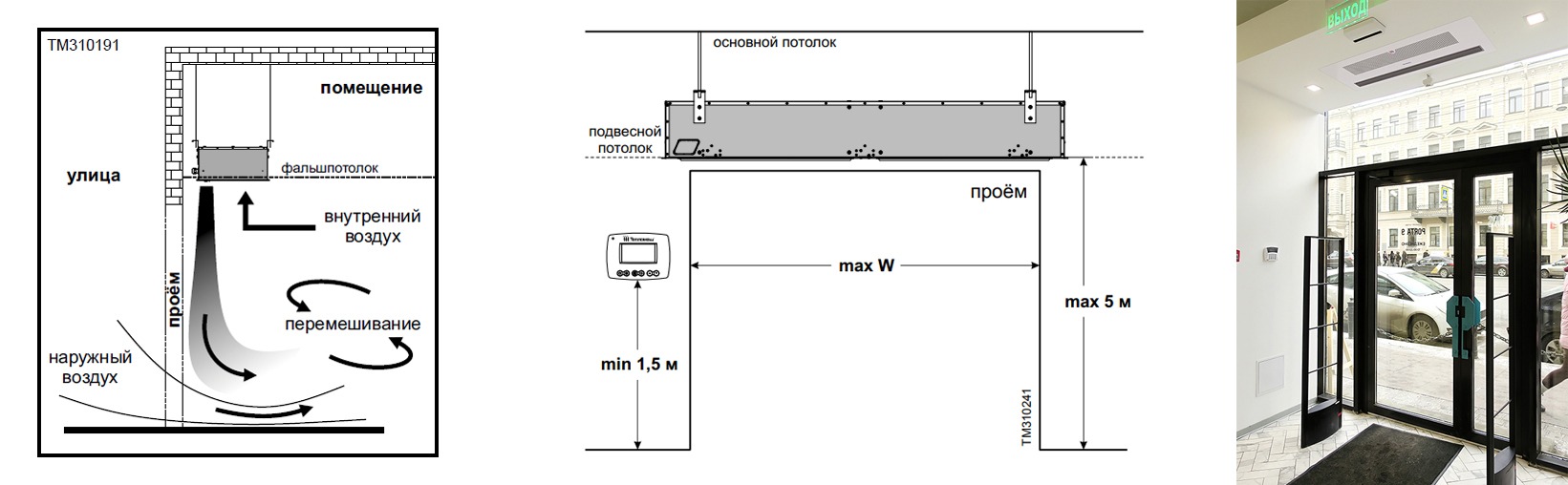 Создает нагретый воздушный поток, который смешивается с холодным уличным воздухом в пределах тамбура или вестибюля. Таким образом завеса препятствует проникновению холодного воздуха с улицы в помещение. Встраивается в подвесной или фальш-потолок над дверным проёмом, на высоте от 3 до 5 м. Устанавливаются над проёмами магазинов, офисов, складов, гаражей и т.п.