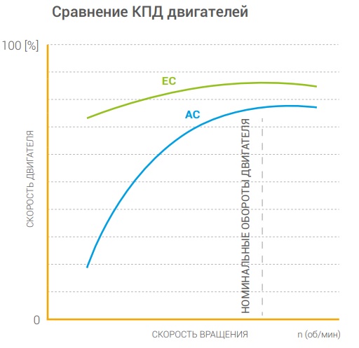 • Основным преимуществом является электродвигатель ЕС с высокой энергоэффективностью, потребление электричества на 40% меньше аналогов.