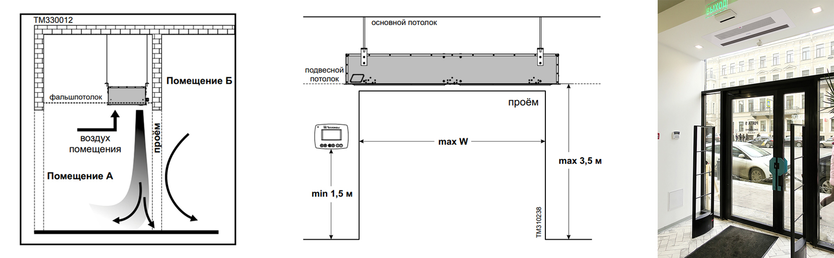 Создает воздушный поток в проёме, преграждающий проникновению холодного воздуха с улицы в помещение. Встраивается в подвесной или фальш-потолок над дверным проёмом, на высоте от 2 до 3,5 м. Устанавливаются в магазинах, ресторанах, гостиницах, бизнес центрах и т.п. Применяются, в основном, для защиты проемов, оборудованных тамбуром.