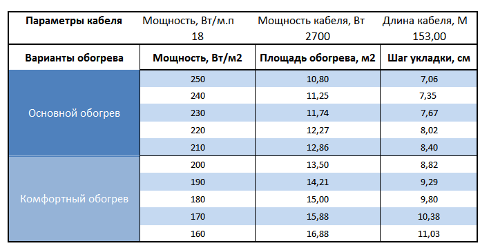 Самостоятельно высчитать какую площадь может обогреть секция нагревательного кабеля, нужно мощность секции разделить на вид обогрева (комфортный, основной или холодных помещений) и получим количество квадратных метров обогрева пола.